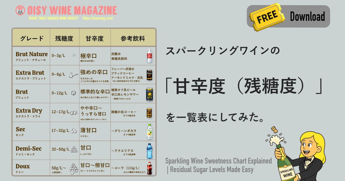 “スパークリングワインの甘辛度(残糖度)” をダウンロード SparklingwineAmakaradoHyou.png – 2147 回のダウンロード – 394.66 KBスパークリングワインの甘辛度(残糖度)の一覧表(テキスト版)